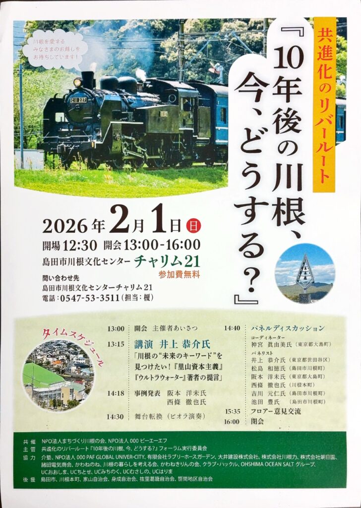 - 講演:井上恭介氏「川根の“未来のキーワード”を見つけたい!『里山資本主義』『ウルトラウォーター』著者の提言」